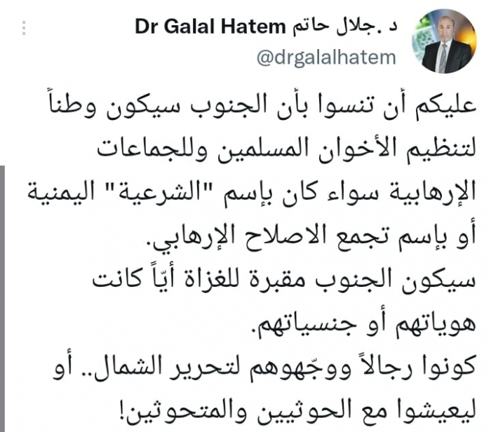 ووجه في تغريدة على حسابه بموقع التدوين المصغر تويتر، اليوم حديثه إلى الشرعية الإخوانية قائلا: "عليكم أن تنسوا بأن الجنوب سيكون وطناً لتنظيم الأخوان المسلمين وللجماعات الإرهابية سواء كان باسم "الشرعية" اليمنية أو باسم تجمع الاصلاح الإرهابي".