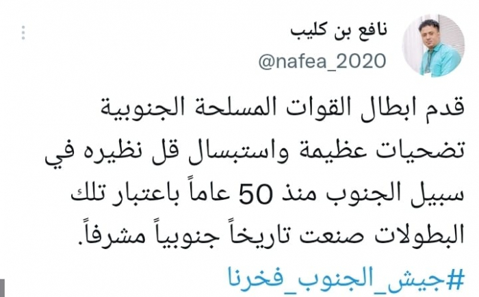 عبر الناشط السياسي نافع بن كليب عن تقديره للتضحيات الجسيمة للقوات المسلحة الجنوبية على مدار نصف قرن دفاعا عن الجنوب ومقدراته من أعداء الجنوب وأطماعه.