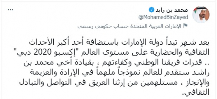 وكتب في تغريدة عبر "تويتر": "قدرات فريقنا الوطني وكفاءتهم، بقيادة أخي محمد بن راشد ستقدم للعالم نموذجا ملهما في الإرادة والعزيمة والإنجاز، مستلهمين من إرثنا العريق في التواصل والتبادل الثقافي".