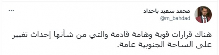 أكد الناشط السياسي محمد سعيد باحداد، أنه من المقرر صدور مجموعة من القرارات في القريب العاجل، وصفها بـ"القوية"، ستحدث تغييرا بالجنوب.