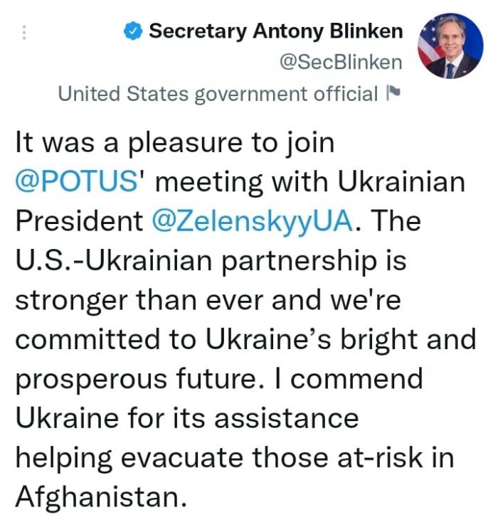 واختتم قائلا: "إنني أثني على أوكرانيا لمساعدتها في إجلاء المعرضين للخطر في أفغانستان".