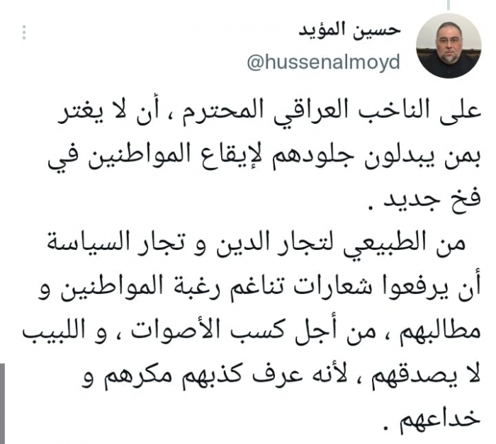 حذر الناشط السياسي حسين المؤيد الناخبين العراقيين ممن وصفهم بتجار الدين والسياسة، الساعون لكسب أصواتهم بخداع ومكر.