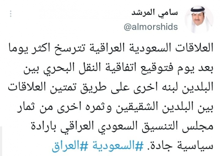 وأشار في تغريدة على حسابه بموقع التدوين المصغر تويتر، اليوم إلى أن: "العلاقات السعودية العراقية تترسخ أكثر يوما بعد يوم".