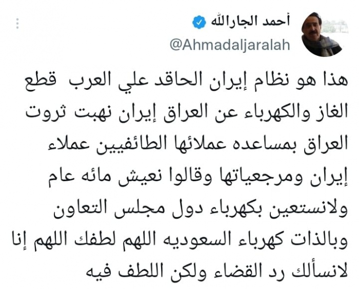 وشدد في تغريدة على حسابه بموقع التدوين المصغر تويتر، اليوم على أن: "هذا هو نظام إيران الحاقد علي العرب، قطع الغاز والكهرباء عن العراق".