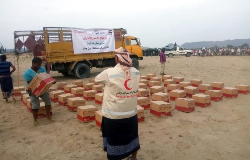 وزعت هيئة الهلال الأحمر الإماراتي، أمس، مساعدات غذائية على الأهالي والنازحين في مناطق بمحافظتي الحديدة وأبين.