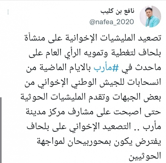 وتابع: "وتقدم المليشيات الحوثية حتى أصبحت على مشارف مركز مدينة مأرب"، معتبرا أن: "التصعيد الإخواني على بلحاف يفترض يكون بمحور بيحان لمواجهة الحوثيين".