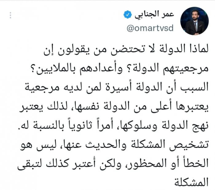 وأجاب قائلا: "السبب أن الدولة أسيرة لمن لديه مرجعية يعتبرها أعلى من الدولة نفسها، لذلك يعتبر نهج الدولة وسلوكها، أمراً ثانوياً بالنسبة له"، مشددا على أن: "تشخيص المشكلة والحديث عنها، ليس هو الخطأ أو المحظور، ولكن اعتبر كذلك لتبقى المشكلة".