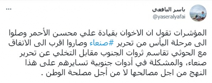 وأشار في تغريدة على حسابه بموقع التدوين المصغر تويتر، اليوم إلى أن: "المؤشرات تقول إن الإخوان بقيادة علي محسن الأحمر وصلوا إلى مرحلة اليأس من تحرير صنعاء وصاروا أقرب إلى الاتفاق مع الحوثي على تقاسم ثروات الجنوب مقابل التخلي عن تحرير صنعاء".