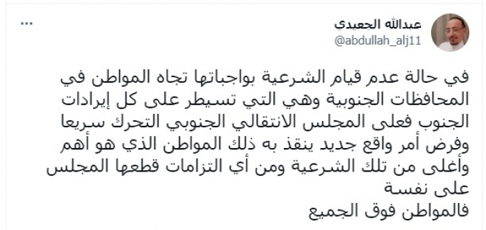 وأضاف: "على المجلس الانتقالي الجنوبي التحرك سريعا وفرض أمر واقع جديد ينقذ به ذلك المواطن الذي هو أهم وأغلى من تلك الشرعية ومن أي التزامات قطعها المجلس على نفسه".