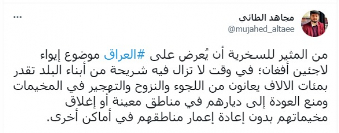 سخرالكاتب والباحث السياسي مجاهد الطائي، من العرض الذي قُدم مؤخرا للعراق لاستقبال لاجئين أفغان، في ظل وجود مئات الآلاف من العراقيين لاجئين ونازحين.