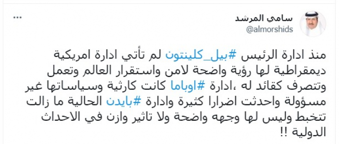 وكتب في تغريدة عبر "تويتر"، اليوم: "منذ إدارة الرئيس بيل كلينتون لم تأتِ إدارة أمريكية ديمقراطية لها رؤية واضحة لأمن واستقرار العالم وتعمل وتتصرف كقائد له".