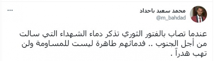 ووجه رسالة لشعب الجنوب، قائلا: "عندما تصاب بالفتور الثوري تذكر دماء الشهداء التي سالت من أجل الجنوب".