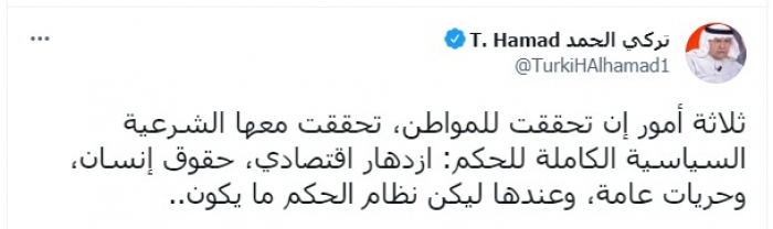 أكد المحلل السعودي تركي الحمد، أن هناك ثلاثة أمور من الضروري تحقيقها للمواطن، حتى يكتسب نظام الحكم الشرعية السياسية.