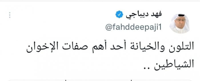 وشدد في تغريدة على حسابه بموقع التدوين المصغر تويتر، اليوم على أن: "التلون والخيانة أحد أهم صفات الإخوان الشياطين".
