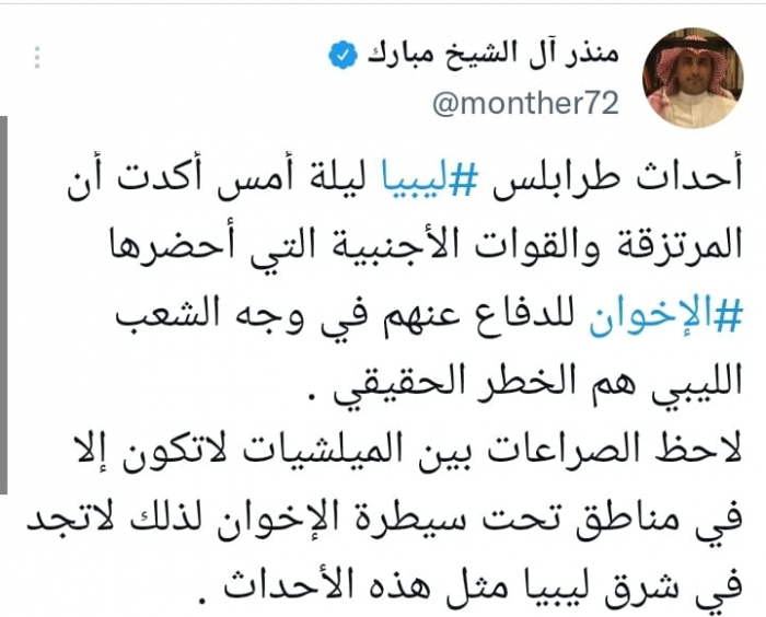 وحذر في تغريدة على حسابه بموقع التدوين المصغر تويتر، اليوم من أن: "أحداث طرابلس ليبيا ليلة أمس، أكدت أن المرتزقة والقوات الأجنبية التي أحضرها الإخوان للدفاع عنهم في وجه الشعب الليبي هم الخطر الحقيقي".