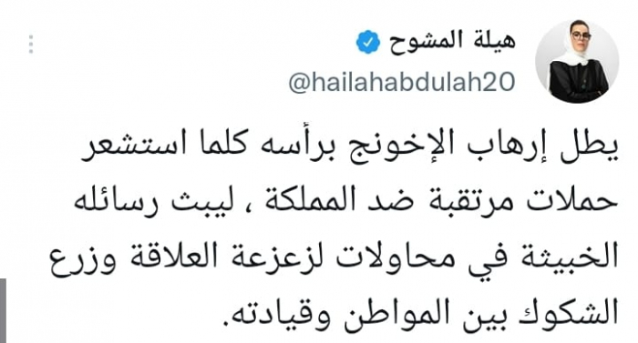 وحذرت في تغريدة على حسابها بموقع التدوين المصغر تويتر، اليوم من أنه: "يطل إرهاب الإخونج برأسه كلما استشعر حملات مرتقبة ضد المملكة".