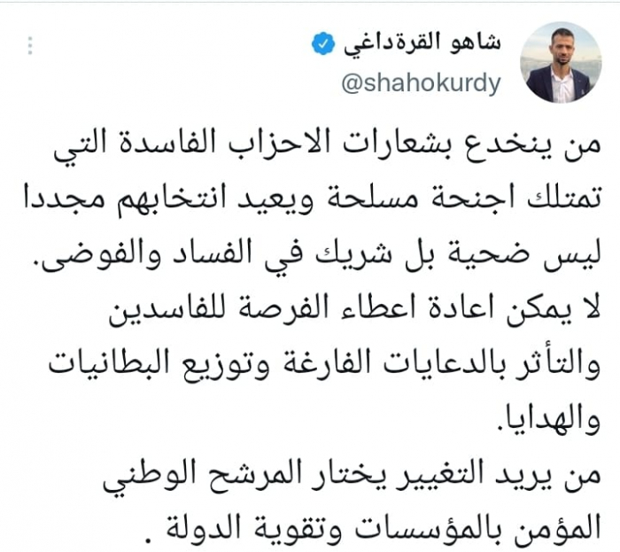 وشدد في تغريدة على حسابه بموقع التدوين المصغر تويتر، اليوم على أن: "من ينخدع بشعارات الأحزاب الفاسدة التي تمتلك أجنحة مسلحة ويعيد انتخابهم مجددا ليس ضحية بل شريك في الفساد والفوضى".