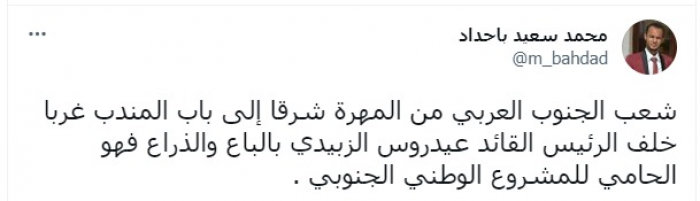 وقال في تغريدة عبر "تويتر"، اليوم: "شعب الجنوب العربي من المهرة شرقا إلى باب المندب غربا خلف الرئيس القائد عيدروس الزُبيدي بالباع والذراع فهو الحامي للمشروع الوطني الجنوبي".
