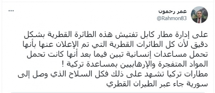 وطالب في تغريدة عبر "تويتر"، اليوم، إدارة مطار كابل بتفتيش هذه الطائرة بشكل دقيق، مرجعا الأسباب إلى أن كل الطائرات القطرية التي تم الإعلان عنها بأنها تحمل مساعدات إنسانية تبين فيما بعد أنها كانت تحمل المواد المتفجرة والإرهابيين بمساعدة تركية.