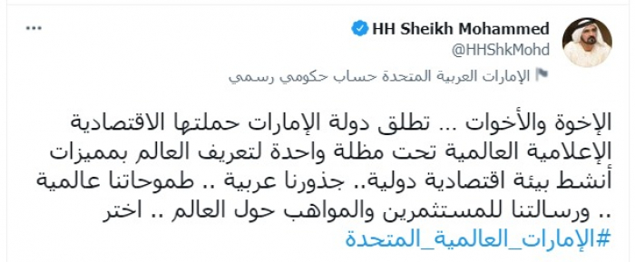 وأوضح في تغريدة عبر "تويتر"، اليوم: "الإخوة والأخوات.. تطلق دولة الإمارات حملتها الاقتصادية الإعلامية العالمية تحت مظلة واحدة لتعريف العالم بمميزات أنشط بيئة اقتصادية دولية".