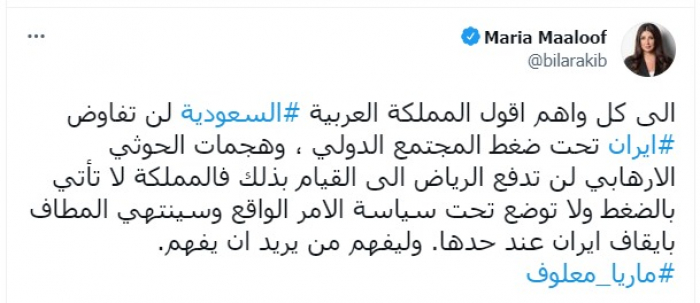 وجهت الإعلامية اللبنانية ماريا معلوف، رسالة إلى من وصفتهم بـ"الواهمين"، الذين يرون أن السعودية قد ترضخ للهمجية الإيرانية الممثلة في الهجمات الإرهابية التي تنفذها مليشيا الحوثي.