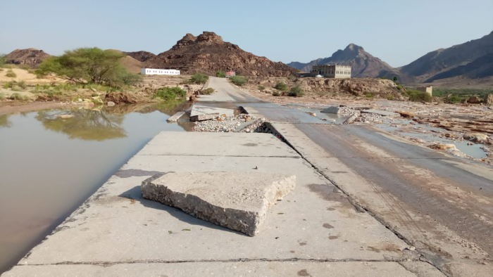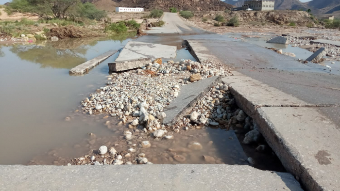 شهدت مديرية الروضة في محافظة شبوة، اليوم الاثنين، انهيار جسر وادي ثنية، جراء سقوط الأمطار الغزيرة.
