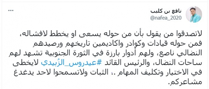 وقال: "فمن حوله قيادات وكوادر وأكاديميين تاريخهم ورصيدهم النضالي ناصع، ولهم أدوار بارزة في الثورة الجنوبية تشهد لهم ساحات النضال".