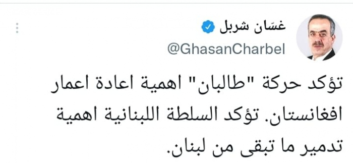 وعلق في تغريدة على حسابه بموقع التدوين المصغر تويتر، اليوم على المشهد ساخرا بقوله: "تؤكد حركة (طالبان) أهمية إعادة إعمار أفغانستان، متابعا: "تؤكد السلطة اللبنانية أهمية تدمير ما تبقى من لبنان".