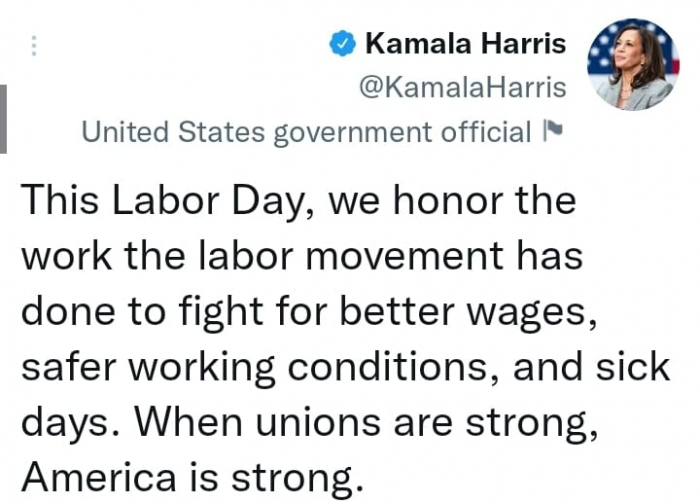 أكدت نائبة الرئيس الأمريكي كامالا هاريس، أن الولايات المتحدة الأمريكية، تستمد قوتها من نقاباتها العمالية، مشيرة في يوم عيد العمال الأمريكي، أن الحركة العمالية ناضلت لانتزاع حقوقها.