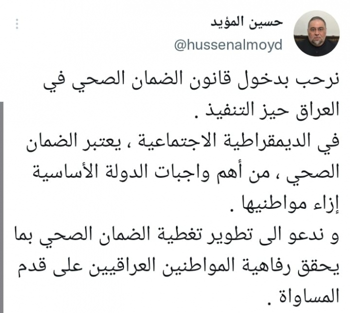 وأشار في تغريدة على حسابه بموقع التدوين المصغر تويتر، اليوم إلى أننا: "نرحب بدخول قانون الضمان الصحي في العراق حيز التنفيذ".