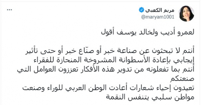 انتقدت الكاتبة الصحفية مريم الكعبي، الإعلامي عمرو أديب، والمخرج خالد يوسف، بعد اللقاء التليفزيوني الذي جمع بينهما أمس.