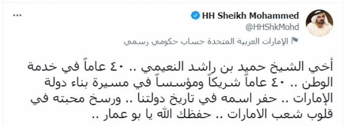 وقال في تغريدة عبر "تويتر"، اليوم: "أخي الشيخ حميد بن راشد النعيمي.. 40 عاما في خدمة الوطن.. 40 عاما شريكا ومؤسسا في مسيرة بناء دولة الإمارات".