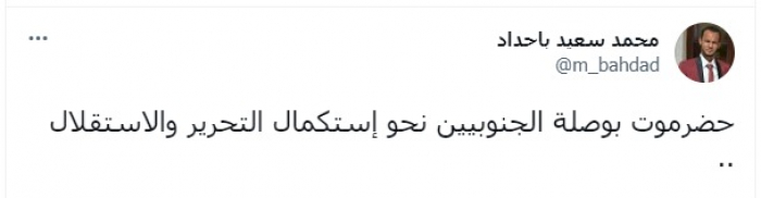 وكتب في تغريدة عبر "تويتر"، رصدها المشهد العربي: "حضرموت بوصلة الجنوبيين نحو استكمال التحرير والاستقلال".