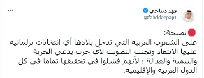 وقال: "نصيحة.. على الشعوب العربية التي تدخل بلادها أي انتخابات برلمانية عليها الابتعاد وتجنب التصويت لأي حزب يدعي الحرية والتنمية والعدالة".