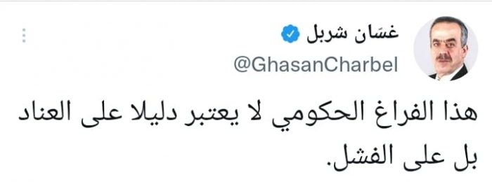 وقال في تغريدة على حسابه بموقع التدوين المصغر تويتر، اليوم إن: "هذا الفراغ الحكومي لا يعتبر دليلا على العناد بل على الفشل".