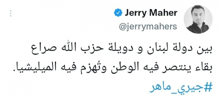 اعتبر الكاتب الصحفي جيري ماهر، أن هناك صراع وجود بين لبنان ومليشيا حزب الله الموالية لنظام ملالي طهران، مشددا على ضرورة انتصار الدولة وبقائها.