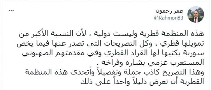وقال في تغريدة عبر "تويتر"، اليوم، رصدها المشهد العربي: "هذه المنظمة قطرية وليست دولية، لأن النسبة الأكبر من تمويلها قطري".