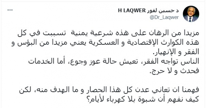 أضاف: "فهمنا أن تعاني عدن كل هذا الحصار وما الهدف منه"، متسائلا: "لكن كيف نفهم أن شبوة بلا كهرباء لأيام؟"، وذلك في إشارة إلى انعدام الخدمات في عهد الإخواني المدعو محمد بن عديو.