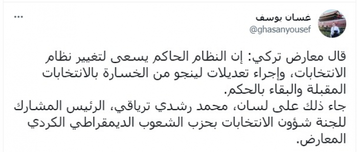 وأوضح في تغريدة عبر "تويتر"، اليوم، نقلا عن معارض تركي: "النظام الحاكم يسعى لتغيير نظام الانتخابات، وإجراء تعديلات لينجو من الخسارة بالانتخابات المقبلة والبقاء بالحكم".