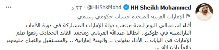 وكتب في تغريدة عبر "تويتر"، اليوم: "أثناء استقبالي اليوم لبعثة منتخب دولة الإمارات المشاركة في دورة الألعاب البارالمبية في طوكيو.. أبطالنا عبدالله العرياني ومحمد القايد الحمادي رفعوا علم الإمارات في اليابان".