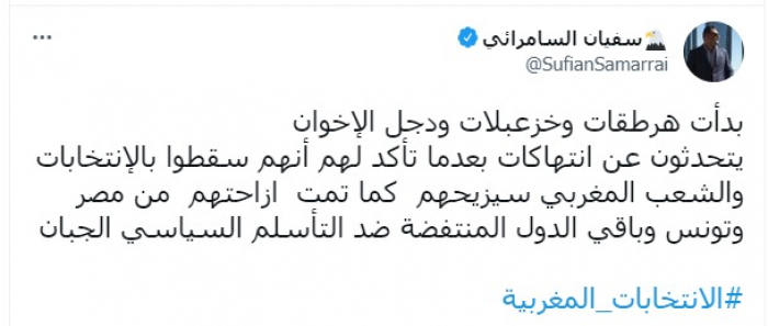 وأضاف: "والشعب المغربي سيزيحهم كما تمت إزاحتهم من مصر وتونس وباقي الدول المنتفضة ضد التأسلم السياسي الجبان"، مختتما تغريدته بهاشتاج: "الانتخابات المغربية".