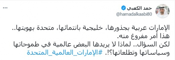 وأردف: "لكن السؤال.. لماذا لا يريدها البعض عالمية في طموحاتها وسياساتها وتطلعاتها؟، مختتما: "الإمارات العالمية المتحدة".