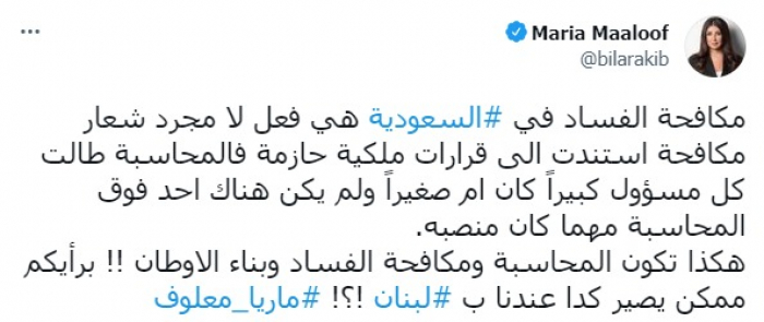 أشادت الإعلامية ماريا معلوف بجهود المملكة العربية السعودية في تتبع الفاسدين ومنع الفساد، ومحاسبة المتجاوزين، مؤكدة أنها تطبق المحاسبة بالقرارات وليس الشعارات.