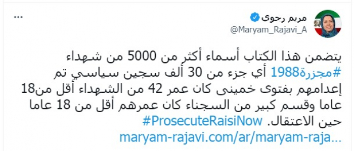 وأشارت في تغريدة عبر "تويتر"، اليوم، إلى كتاب يتضمن أسماء أكثر من 5 آلاف شهيد بمجزرة 1988، قائلة: "أي جزء من 30 ألف سجین سیاسي تم إعدامهم بفتوی خمینی".