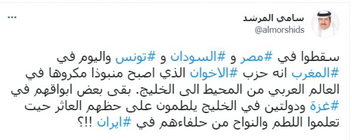 وأشار في تغريدة على حسابه بموقع التدوين المصغر تويتر، اليوم إلى أنهم: "سقطوا في مصر والسودان وتونس واليوم في المغرب، إنه حزب الإخوان".