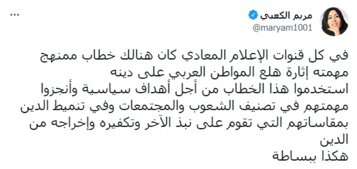 حذرت الكاتبة الصحفية مريم الكعبي، من خطاب الإعلام المعادي واعتماده على بث حالة من الفزع بين المواطنين، لأغراض سياسية.وأكدت في تغريدة على حسابها بموقع التدوين المصغر تويتر، اليوم أنه: "في كل قنوات الإعلام المعادي كان هنالك خطاب ممنهج مهمته إثارة هلع المواطن العربي على دينه".