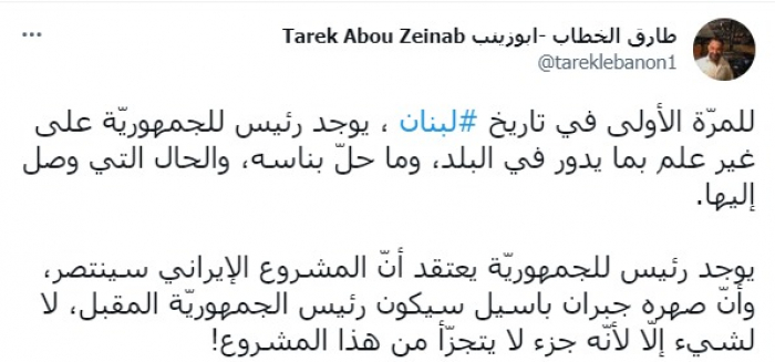وأوضح في تغريدة على حسابه بموقع التدوين المصغر تويتر، اليوم أنه: "للمرّة الأولى في تاريخ لبنان، يوجد رئيس للجمهوريّة على غير علم بما يدور في البلد، وما حلّ بناسه، والحال التي وصل إليها".