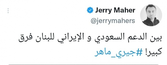أشار الكاتب الصحفي جيري ماهر إلى كالاختلاف بين طبيعة دعم السعودية وإيران للبنان، في إشارة للمساعدات المقدمة من الرياض و تهريب السلاح الإيراني لمليشيا حزب الله الموالية لنظام ملالي طهران.