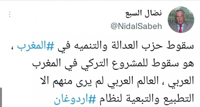 وأشار في تغريدة على حسابه بموقع التدوين المصغر تويتر، اليوم إلى أن: "سقوط حزب العدالة والتنميه في المغرب هو سقوط للمشروع التركي في المغرب العربي".
