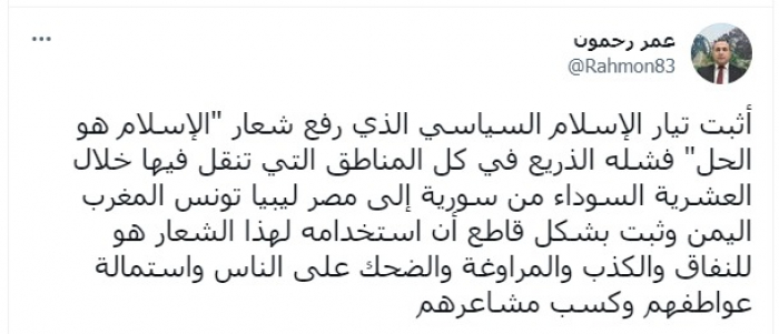 وكتب في تغريدة عبر "تويتر"، اليوم: "أثبت تيار الإسلام السياسي الذي رفع شعار الإسلام هو الحل فشله الذريع في كل المناطق التي تنقل فيها خلال العشرية السوداء".